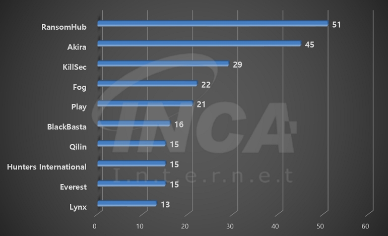 2024년 12월(12월 1일 ~ 12월 31일)에 발생한 데이터 유출 현황을 랜섬웨어 진단명 별로 비교하였을 때 “RansomHub” 랜섬웨어가 51건으로 가장 많은 데이터 유출이 있었고, “Akira” 랜섬웨어와 “Killsec” 랜섬웨어가 각각 45건과 29건의 유출 사례를 기록했다.