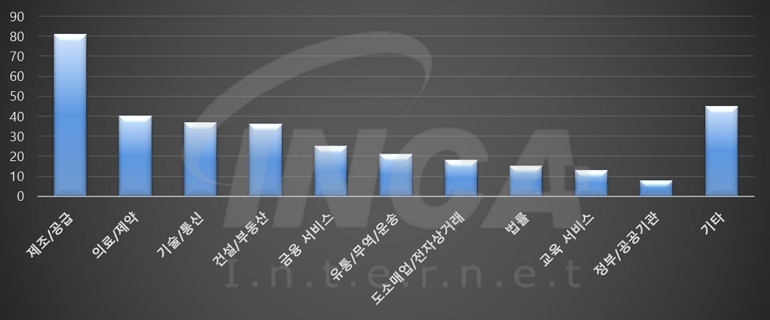 2024년 12월(12월 1일 ~ 12월 31일)에 발생한 데이터 유출 건을 산업별로 비교하였을 때 제조/공급 분야가 가장 많은 공격을 받았고, 의료/제약 분야와 기술/통신 분야가 그 뒤를 따랐다.