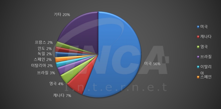 2024년 12월(12월 1일 ~ 12월 31일)에 발생한 데이터 유출 건을 국가별로 비교하였을 때 미국이 56%로 가장 높은 비중을 차지했고, 캐나다와 영국이 각각 7%와 4%로 그 뒤를 따랐다.