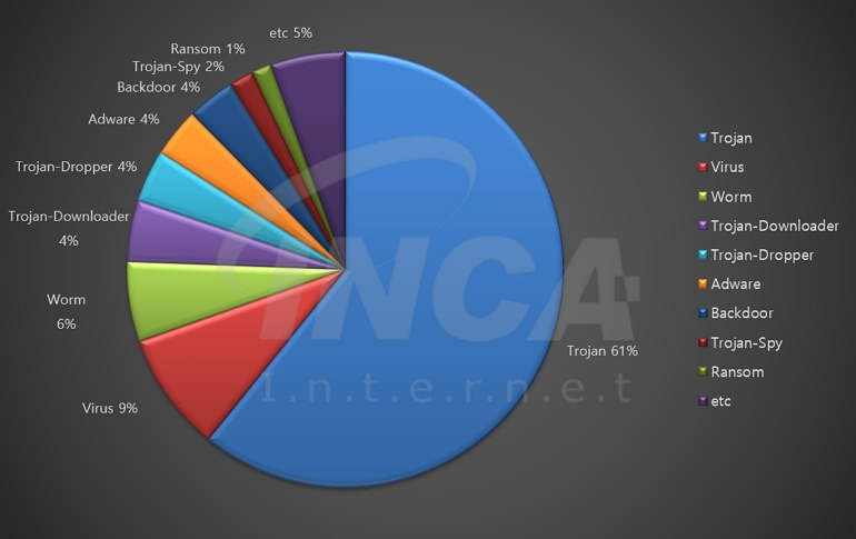 2024년 12월(12월 1일 ~ 12월 31일) 한 달간 잉카인터넷 대응팀은 국내외에서 수집된 악성코드 현황을 조사하였으며, 유형별로 비교하였을 때 “Trojan”이 61%로 가장 높은 비중을 차지했고, “Virus”가 9%로 그 뒤를 따랐다.