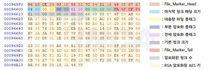 암호화가 완료되면 파일 끝에 파일 마커와 암호화 정보를 저장하는 0x428 크기의 데이터 구조를 추가한다. 파일 마커는 해당 파일의 암호화 유무를 확인하는 용도로 File_Marker_Head를 xxhash 알고리즘으로 해싱한 값과 File_Marker_Tail 값이 일치하면 암호화된 파일로 판단한다. 또한, 데이터 구조는 대용량 파일과 부분/전체 암호화를 구분하는 플래그, 청크 정보 및 암호화 키 등 복호화에 필요한 정보를 저장한다. 단, 파일을 암호화하는데 사용된 AES 키는 다시 RSA 공개키로 암호화되기 때문에 공격자의 개인키가 있어야 복호화가 가능하다.