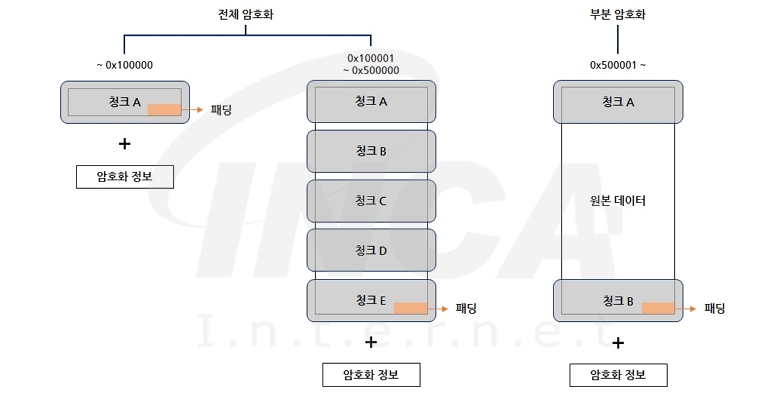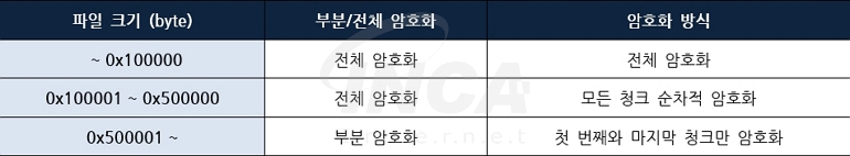 [그림 2]는 [표 2]에서 설명한 암호화 방식을 시각적으로 나타낸 것이다. 파일이 0x500000 바이트 이하이면 최대 5개의 청크가 생성되고 0x100000 바이트를 초과한 파일은 생성된 청크들이 순차적으로 암호화된다. 0x500000 바이트를 초과하는 파일은 처음과 끝 부분만 청크 단위로 암호화하는 부분 암호화 방식이 적용된다. 암호화 중 생성된 마지막 청크는 0x10 바이트의 배수에 맞춰 패딩을 추가하고 패딩의 길이는 파일 끝에 암호화 정보와 함께 저장된다.