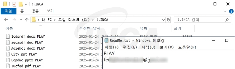 Play 랜섬웨어는 이동식 드라이브와 네트워크 드라이브를 포함한 모든 드라이브를 대상으로 파일을 암호화한다. 암호화된 파일은 파일명 뒤에 “.PLAY” 확장자를 추가하고 공격자의 이메일 주소가 포함된 내용과 함께 “ReadMe.txt”라는 이름의 랜섬노트를 생성한다.