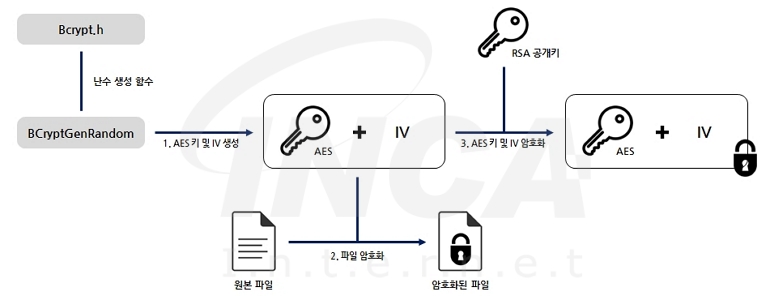 다음으로 각 청크를 암호화할 때는 AES-256-CBC 알고리즘이 사용된다. 암호화에 필요한 AES 키와 IV(Initial Vector)는 윈도우 CNG(Cryptography API: Next Generation) API에 포함된 BCrypt.h 헤더 파일의 BCryptGenRandom 함수를 이용해 난수 형태로 생성된다. 이 과정에서 암호화에 사용된 AES 키와 IV는 공격자가 생성해둔 RSA 공개키로 다시 암호화해 키 정보를 숨긴다.