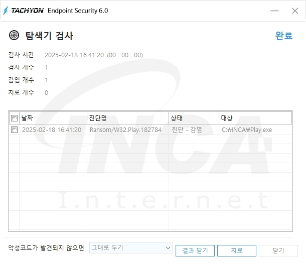 상기 악성코드는 잉카인터넷 안티바이러스 제품 TACHYON Internet Security 6.0에서 진단 및 치료가 가능하다.