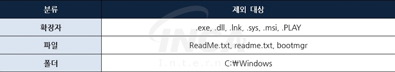 단, 암호화 대상에서 Windows 폴더, 실행 파일 및 부트 매니저 등 운영체제 동작에 영향을 줄 수 있는 파일과 “.PLAY” 확장자 및 랜섬노트는 제외한다.