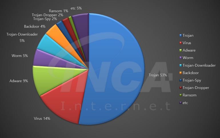 2025년 3월(3월 1일 ~ 3월 31일) 한 달간 잉카인터넷 대응팀은 국내외에서 수집된 악성코드 현황을 조사하였으며, 유형별로 비교하였을 때 “Trojan”이 53%로 가장 높은 비중을 차지했고, “Virus”가 14%로 그 뒤를 따랐다.