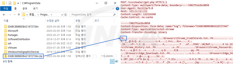 정보 수집 이후에는 스크린샷을 찍고 앞서 저장한 데이터와 함께 Zip 파일로 압축한 뒤 공격자의 C&C 서버로 전송한다. 전송이 완료되면 폴더와 압축 파일 모두 삭제해 정보를 탈취해 간 흔적을 지운다. 아래 [그림 3]은 공격자에게 전송한 HTTP 패킷이며 내부에 압축 파일이 포함된 것을 확인할 수 있다.