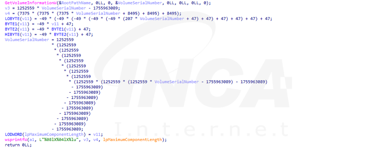 우선 이 악성코드는 앞으로 수집할 데이터와 파일을 저장할 목적으로 운영체제가 설치된 드라이브의 볼륨 일련번호를 확인한 뒤 [그림 1]의 연산식으로 계산된 22자리의 문자열을 이름으로 한 폴더를 생성한다.