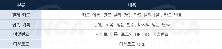 - 웹 브라우저 수집 대상 : Chrome, Edge, Brave, Opera, Vivaldi, Yandex, Comodo, UR Browser