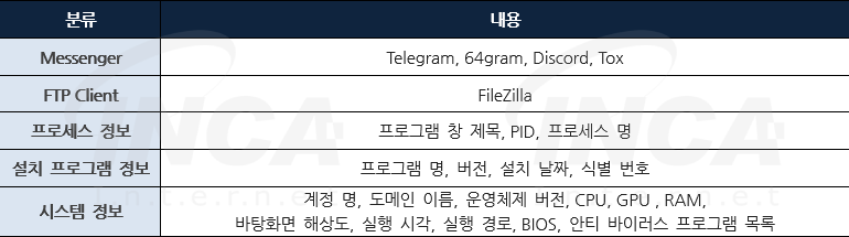 웹 브라우저와 암호화폐 지갑 이외에 Discord나 Telegram 등의 메신저 및 FTP 프로그램의 정보를 수집하고 프로세스 목록과 설치된 프로그램 등의 정보도 각각 텍스트 파일로 저장한다.
