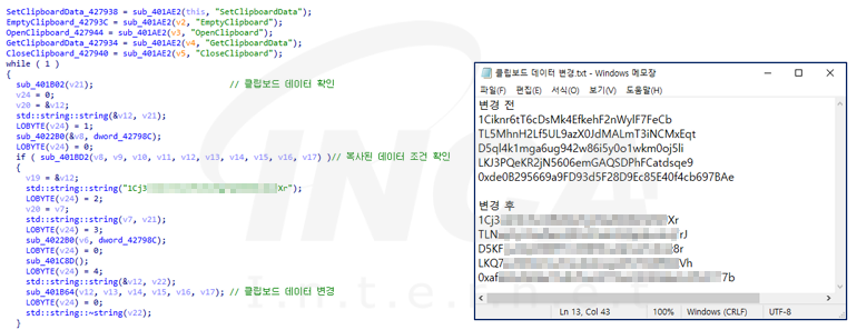 먼저 클립보드 관련 함수를 동적으로 로딩한 뒤 현재 클립보드에 저장된 데이터를 가져온다. 클립보드에 저장된 데이터가 파일 내에 하드코딩된 공격자의 암호화폐 지갑 주소와의 길이 및 첫 2바이트가 일치하면 공격자의 지갑 주소로 변경한다.