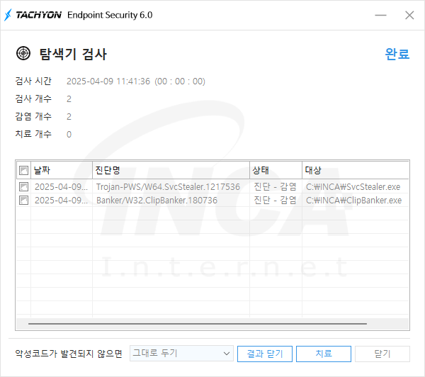 상기 악성코드는 잉카인터넷 안티바이러스 제품 TACHYON Internet Security 6.0에서 진단 및 치료가 가능하다.