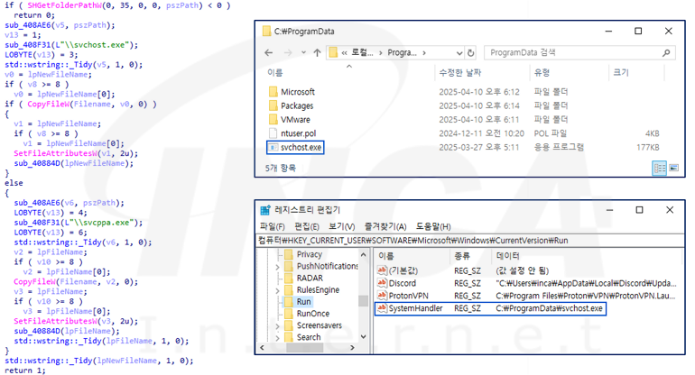 클립보드 데이터 변경 이후로는 ‘%ProgramData%’ 경로에 “svchost.exe”나 “svcppa.exe” 이름으로 자가 복제한 뒤 SetFileAttibutesW 함수로 Hidden(0x02) 속성을 지정해 숨김 처리한다. 그 후 사용자 PC가 부팅할 때마다 자동으로 실행되도록 Run 레지스트리에 SystemHandler라는 이름으로 등록한다.