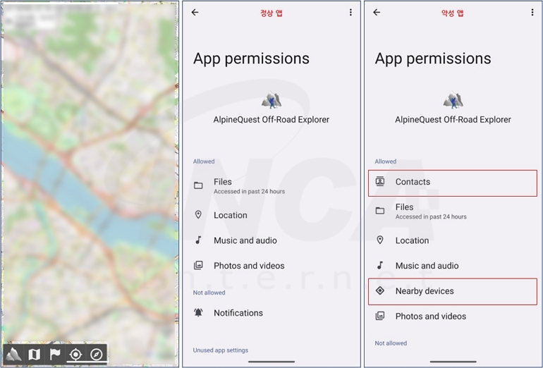 Origin 스파이웨어는 정상 AlpineQuest Pro 앱에 악성코드를 삽입한 형태로 실제 정상 앱과 동일한 기능 및 서비스를 제공한다. 단, 해당 앱을 실행하면 지도 서비스와 관련된 위치 정보 외에도 연락처 및 근처 디바이스 등에 대한 추가 권한을 요구한다.