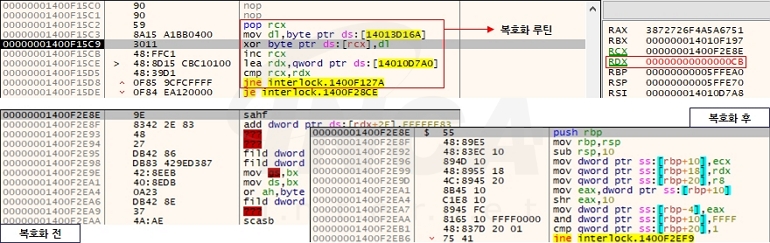 Interlock 랜섬웨어가 실행되면 먼저 VirtualProtect API 를 이용해 메모리 상의 헤더와 코드 섹션의 보호 특성을 변경한다. [그림 1]에서 변경할 보호 특성을 결정하는 메모리 보호 상수는 0x40(PAGE_EXECUTE_READWRITE)으로 대상 영역에 대한 실행, 읽기 및 쓰기가 가능하도록 설정한다. 동적으로 로드된 VirtualProtect API의 주소는 ret 명령어 호출 직전에 ESP 레지스터에 저장돼 함수가 종료되면 해당 API의 시작 주소로 점프한다. 보호 특성 변경 후 RCX 레지스터에 저장된 주소의 함수 데이터를 한 바이트씩 0xCB 값과 XOR 연산해 복호화한다.