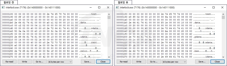 복호화된 함수는 다시 XOR 연산을 이용해 .rdata 섹션에 저장된 PE 데이터를 복호화한다. 해당 PE 데이터는 실질적인 랜섬웨어 동작을 수행하며 현재 프로세스에 할로잉해 실행된다. 프로세스 할로잉은 PE 이미지에 대한 매핑 해제 작업 없이 [그림 1]에서 수정이 가능하도록 메모리 보호 상수가 변경된 헤더 및 코드 섹션의 기존 데이터를 지우고 복호화된 PE 데이터를 복사한 후 변경된 EP를 호출한다.