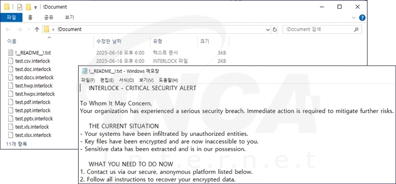 Interlock 랜섬웨어는 주로 피싱 이메일과 명령어를 복사해 실행하도록 유도하는 ClickFix 등의 사회 공학(Social Engineering) 기법을 이용해 유포되며 파일을 암호화한 후 확장자를 “.interlock”으로 변경하고 각 폴더에 랜섬노트를 생성한다.