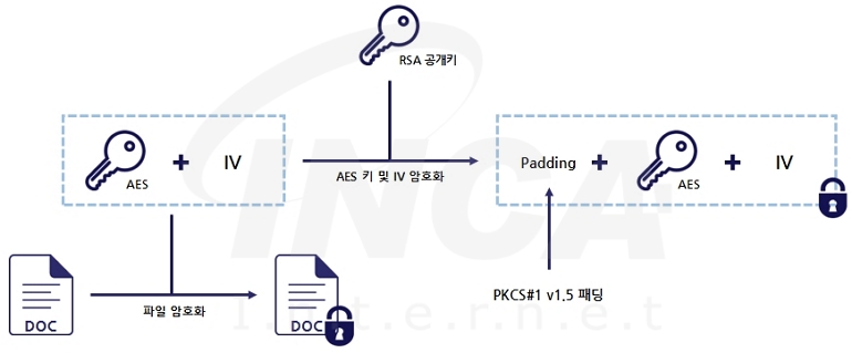 파일 암호화는 암호화 알고리즘을 제공하는 오픈소스 라이브러리 LibTomCrypt를 사용한다. 먼저 랜섬웨어는 0x20바이트의 암호키와 0x10바이트의 IV(Initial Vector)를 랜덤으로 생성한 후 AES-256-CBC 알고리즘으로 파일을 암호화한다. 암호키와 IV는 PKSC#1 v1.5 패딩 방식을 이용해 RSA-4096의 키 길이(모듈러스의 비트 수)인 0x200 바이트에 맞춰 패딩을 추가하고 공격자의 공개키로 암호화한다. 암호화된 암호키와 IV는 파일 끝에 추가되며 이는 공격자의 개인키가 있어야 복호화가 가능하다.