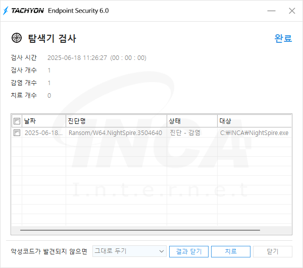 상기 악성코드는 잉카인터넷 안티바이러스 제품 TACHYON Internet Security 6.0에서 진단 및 치료가 가능하다.
