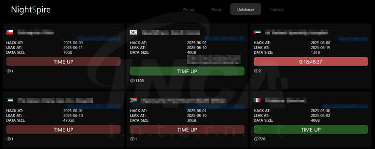 NightSpire 조직은 공격 대상에게서 데이터를 탈취한 뒤 기한 내에 연락이 없으면 자신들이 운영하는 데이터 유출 사이트에 게시해 금전적인 협상을 요구한다. 데이터 유출 사이트에는 자신들의 조직 설명과 공격한 대상 및 유출 데이터 목록이 있으며 Onion 메일 주소와 텔레그램 및 Tox 메신저 ID 등을 표시해 자신들에게 연락할 방법을 설명한다. 아래 [그림 1]은 유출 목록 페이지이며 공격 대상의 국가, 이름, 공격 및 데이터 공개 일자를 표시하고 공개 시기를 초 단위로 세며 피해 업체에 경고하고 있다. 해당 페이지 내의 목록 중에서는 국내 기업 2곳이 공격받아 데이터가 유출된 정황이 발견됐다.