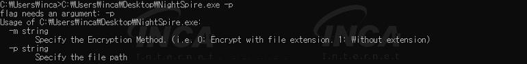 NightSpire 랜섬웨어는 실행 옵션을 지정해 실행할 수 있다. -p 옵션을 사용하면 경로 지정이 가능해 설정한 경로를 암호화한다. -m 옵션은 확장자를 유지하거나 변경하는 옵션이며 기본값은 0으로 확장자를 “.nspire”로 변경한다.