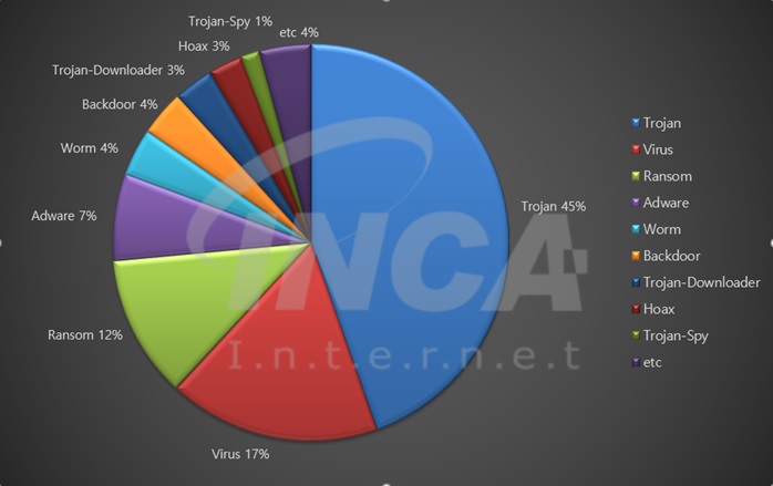 2025년 6월(6월 1일 ~ 6월 30일) 한 달간 잉카인터넷 대응팀은 국내외에서 수집된 악성코드 현황을 조사하였으며, 유형별로 비교하였을 때 “Trojan”이 45%로 가장 높은 비중을 차지했고, “Virus”가 17%로 그 뒤를 따랐다.