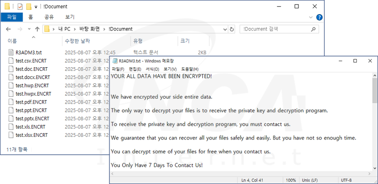 Gunra 랜섬웨어는 감염된 시스템의 파일을 암호화하고 파일명 뒤에 .ENCRT 확장자를 추가한다. 암호화 대상이 되는 각 폴더에는 랜섬노트 R3ADM3.txt를 드롭해 감염 사실을 알리고 랜섬머니를 요구한다.