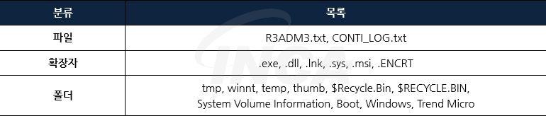 랜섬웨어는 GetLogicalDriveStrings를 이용해 유효한 드라이브를 검색하고 검색된 드라이브를 순회하면서 [표 1]의 폴더, 파일 및 확장자를 제외한 암호화 대상 리스트를 생성한다. 단, C 드라이브의 경우 ‘C:\Users’ 경로만 대상으로 한다. 이후 현재 시스템의 논리 프로세서 수에 따라 파일 암호화를 수행하는 스레드를 여러 개 생성하고 암호화 대상 리스트를 스레드에 전달해 암호화를 진행한다.