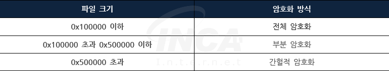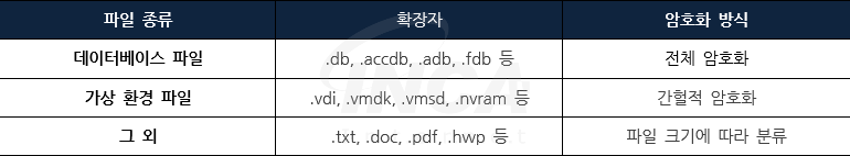 또한 파일 종류와 크기에 따라 전체, 간헐적 및 부분 암호화가 적용된다. 가장 먼저 파일 크기와 상관없이 [표 2]의 확장자에 따라 파일 종류를 분류해 데이터베이스 관련 파일은 전체 암호화를 적용하고 가상 환경 관련 파일은 간헐적 암호화를 적용한다. 두 분류에 포함되지 않는 파일은 [표 3]의 파일 크기에 따라 다시 분류 후 각각 다른 암호화 방식을 적용한다.