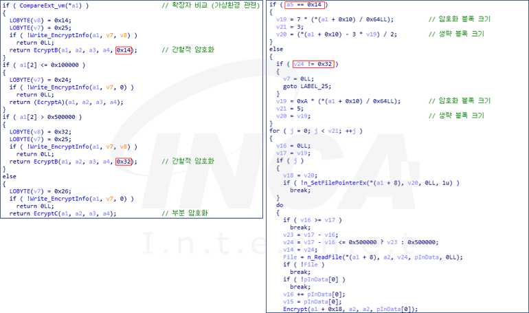 암호화 방식 중 부분 암호화는 파일의 가장 앞 0x100000 바이트만 암호화하는 방식을 사용하며 간헐적 암호화는 파일을 일정 개수의 블록으로 나눠 홀수 번째 블록만 암호화한다. 단 가상 환경 관련 파일과 0x500000 보다 큰 파일에 적용되는 간헐적 암호화는 하기의 계산식에 따라 블록을 나누는 방식에 차이를 둬 구분한다.