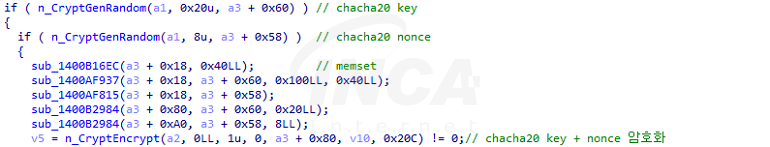 파일 암호화 알고리즘은 ChaCha20으로 암호화할 파일마다 키와 Nonce 값을 랜덤으로 생성해 각기 다른 값을 사용한다. 파일 암호화에 사용된 키는 다시 공격자의 RSA-4096 공개키로 암호화돼 공격자 개인키가 있어야 파일을 복호화할 수 있다.