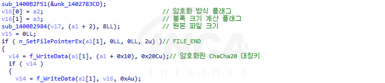 암호화가 완료된 파일은 파일 끝에 암호화된 ChaCha20 대칭키, 두 개의 플래그(Flag) 및 원본 파일의 크기 정보가 순서대로 저장된다. 두 개의 플래그 중 첫 번째 플래그는 전체 암호화, 간헐적 암호화 및 부분 암호화를 구분하며 두 번째 플래그는 간헐적 암호화가 적용된 파일의 암호화 블록 크기를 계산하는데 사용된다. 암호화 블록 계산이 필요 없는 전체 및 부분 암호화는 두 번째 플래그가 0x00 값으로 고정된다.