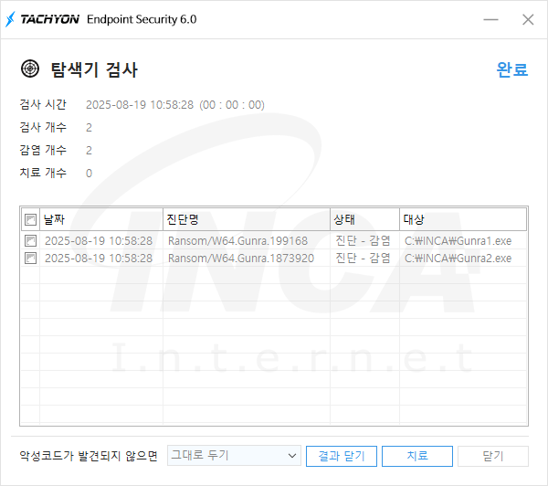 상기 악성코드는 잉카인터넷 안티바이러스 제품 TACHYON Internet Security 6.0에서 진단 및 치료가 가능하다.