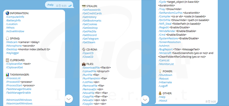 텔레그램에서 “/help” 명령을 실행시키면 아래 [그림 3]과 같이 피해자 PC의 추가적인 시스템 정보를 수집하거나 파일 삭제, 레지스트리 수정 및 PC 제어 등 약 80개 가량의 명령을 확인할 수 있다.