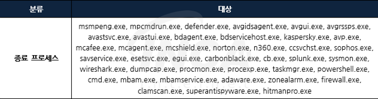 또한 백신 프로그램 및 보안 도구의 실행을 종료하고 백업된 볼륨 새도우 복사본을 삭제하며 복구 불가능하게 만든다. 프로세스를 종료할 때 실행 중인 프로세스 목록을 확인하며 아래 [표 2]의 백신 프로그램이나 보안 도구의 이름을 비교하며 PID 값을 가져와 프로세스를 종료한다. 그리고 vssadmin 명령어로 백업된 볼륨 섀도우 복사본을 삭제한 뒤 시스템 복구 관련 레지스트리의 “DisableSR” 값을 1로 수정해 복구 기능을 비활성화한다.