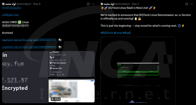 올해 7월에 새로 등장한 BQTLock 랜섬웨어의 변종이 추가로 발견됐다. 외신 보도에 따르면 해당 랜섬웨어는 친팔레스타인 해커 그룹으로 알려진 Liwaa Mohammed와 관련있으며 ZerodayX라는 공격자가 제작한 것으로 전해진다. 공격자는 자신이 운영하는 X 계정에 공격 기업 정보와 보안 업체 분석 보고서를 게시하고 이어서 BQTLock 랜섬웨어의 리눅스 버전과 유출된 자료를 검색할 수 있는 BAQIYAT.osint 도구 공개도 예고했다.