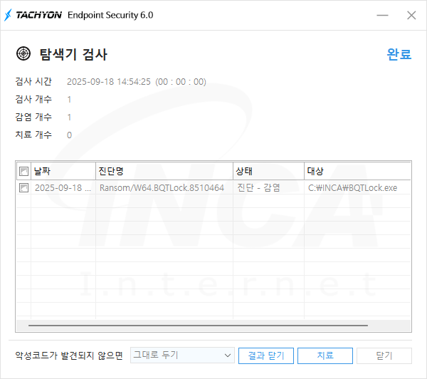 상기 악성코드는 잉카인터넷 안티바이러스 제품 TACHYON Internet Security 6.0에서 진단 및 치료가 가능하다.