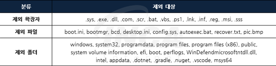 랜섬웨어는 파일을 암호화하는 과정에서 시스템 내 존재하는 A부터 Z까지의 모든 드라이브 경로를 탐색하며 대상 파일을 식별한다. 이 과정에서 ".sss" 확장자를 가진 파일과 랜섬노트 파일을 제외해 중복 암호화를 방지한다. 그리고 'Windows'와 'Program Files' 경로 등 운영체제의 정상 동작에 필수적인 시스템 경로 및 부팅에 영향을 미칠 수 있는 파일은 암호화 대상에서 제외해 사용자 PC가 부팅 불가능한 상태에 빠지는 것을 방지한다.