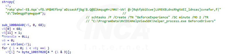 Pubload는 자동 실행을 등록하기 전 정상 EXE 파일과 자기 자신(DLL)을 ‘C:\Users\Public’ 또는 ‘C:\ProgramData’ 경로에 복사한다. 파일 복사가 완료되면 Run 레지스트리 및 작업 스케줄러를 모두 사용하거나 Run 레지스트리만을 사용해 자동 실행을 등록한다. 작업 스케줄러를 등록하는 과정에서 cmd.exe 프로세스를 생성하는 데 사용되는 API 이름과 명령어 문자열이 암호화돼 있는 경우가 존재하며 하드코딩된 Key 값과 XOR 연산해 이를 복호화한다.