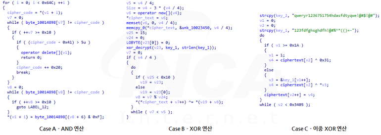 이후 셸 코드 복호화 단계가 되면 간단한 비트 연산부터 대칭키 암호화 알고리즘까지 다양한 방식을 사용해 내부에 암호화된 데이터를 복호화하고 실행한다. Pubload는 점점 더 복잡한 방식으로 셸 코드를 암호화해 탐지를 회피하고 분석 난이도를 높이고 있다.