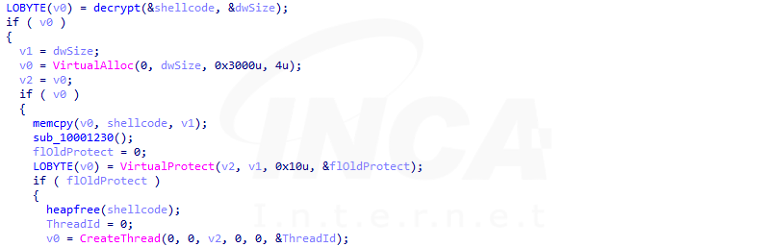 복호화된 셸 코드는 새로운 메모리 공간에 복사한 후 VirtualProtect 함수를 이용해 PAGE_EXECUTE(0x10) 권한을 부여하고 새로운 스레드에 셸 코드의 포인터로 전달해 실행된다.
