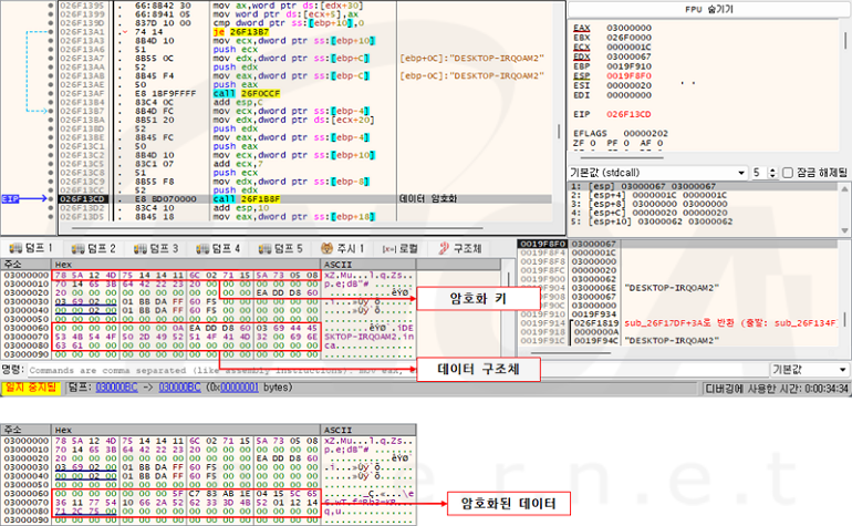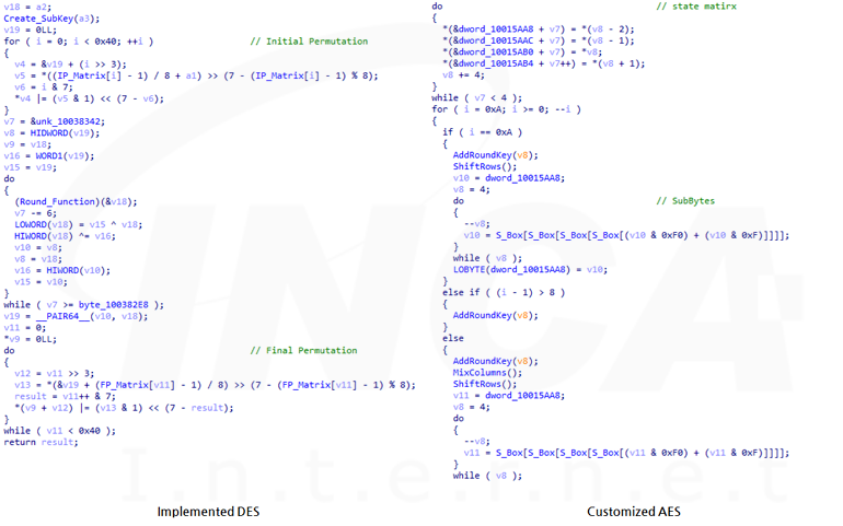 시간이 지남에 따라 단순한 비트 연산에서 Triple DES와 AES 등의 복잡한 암호화 알고리즘을 사용하는 방향으로 발전했으며 외부 라이브러리를 사용하지 않고 각 알고리즘의 단계를 직접 구현했다. 또한 직접 구현한 암호화 알고리즘이 정상적으로 동작하는 범위에 한해서 일부 단계를 수정해 분석을 더 어렵게 하고 있다.