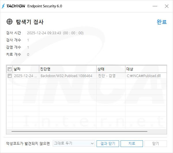 상기 악성코드는 잉카인터넷 안티바이러스 제품 TACHYON Internet Security 6.0에서 진단 및 치료가 가능하다.