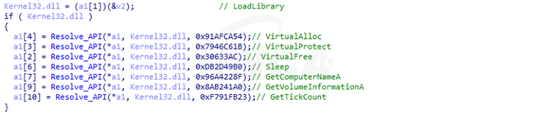 복호화된 셸 코드가 실행되면 먼저 후속 동작에 필요한 API를 동적으로 로드한다. 로드할 API의 이름은 ROR13 해시 값으로 하드코딩돼 있으며 특정 DLL의 익스포트 섹션에 직접 접근해 Name Table에서 해시 값이 일치하는 API를 검색하고 Address Table에서 해당 API의 주소를 복사하는 방식을 사용한다.