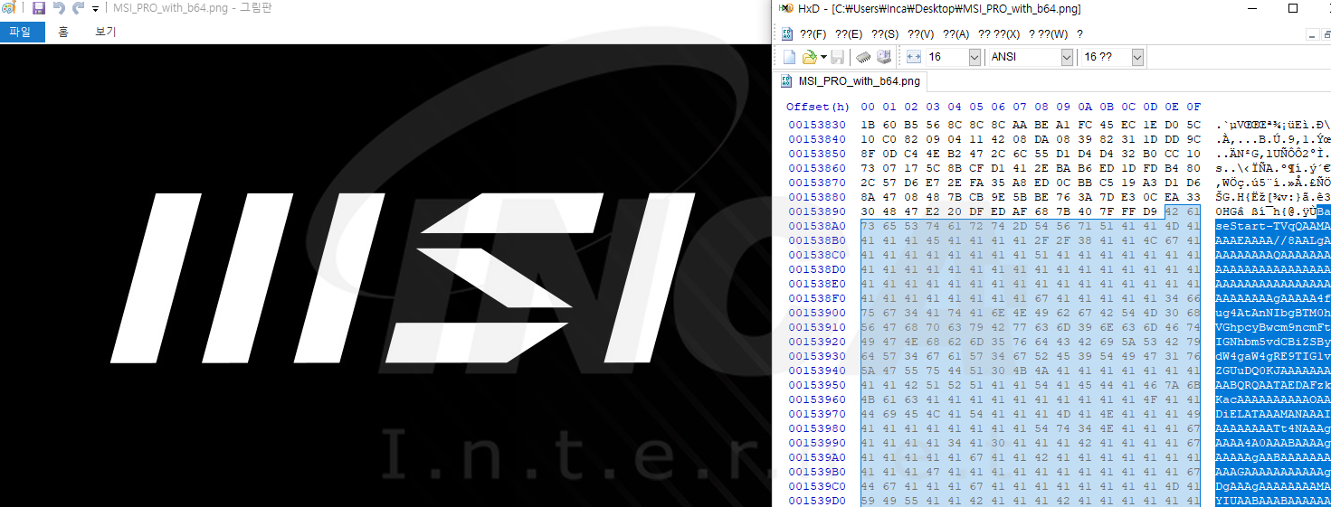 두 번째 자바스크립트는 난독화된 PowerShell 스크립트를 실행해 JPEG 이미지 파일을 다운로드한다. 다운로드한 파일은 겉보기엔 정상적인 이미지 파일이지만, 이미지 포맷 뒤에 “BaseStart-” 문자열로 시작해 “-BaseEnd” 문자열로 끝나는 거대한 Base64 문자열이 존재한다. 악성 PowerShell 스크립트는 이미지 파일로부터 Base64 문자열을 추출, 디코딩해 DLL 파일을 생성하고 로딩한다.